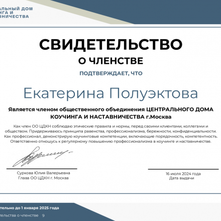 Работаю по стандартам ICF Никаких краткосрочных wow-эффектов, веду к освоению новых стратегий поведения и выходу на качественные изменения в жизни и бизнесе. Член ЦДКН (Центральный Дом Коучинга и Наставничества).