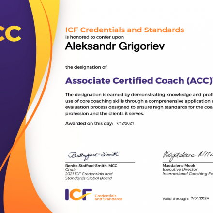 | International Coaching Competence Academy | Leading Professional Coach / Federation: ICF / Accreditation: ACTP | 2020 |