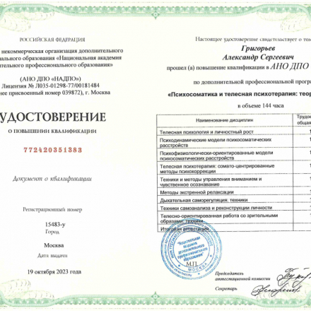 | АНО ДПО НАДПО, Москва | Психосоматика и телесная психотерапия | 2023 |